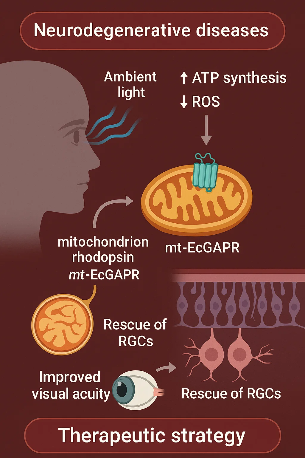 纳米线人工光感受器等视觉假体为视网膜疾病提供了功能修复的可能。然而,视觉假体并不能逆转视网膜神经元的凋亡进程。复旦大学脑科学研究院/脑功能与脑疾病全国重点实验室张嘉漪/颜彪团队与郑州大学第一附属医院康建胜教授团队合作开发了一种新型的定位于线粒体内膜的光动力蛋白mt-EcGAPR,环境光进入青光眼实验模型小鼠眼球后,激活该蛋白并促进线粒体功能,从而缓解视网膜神经节细胞的丧失和视功能的损伤。该研究成果以“Ambient light alleviates retinal neurodegeneration in mice by powering mitochondria via the engineered optoenergetic rhodopsin”(利用工程化光遗传蛋白驱动线粒体以缓解视网膜神经变性)为题,于2025年10月30日在线发表于《Signal Transduction and Targeted Therapy》期刊上。