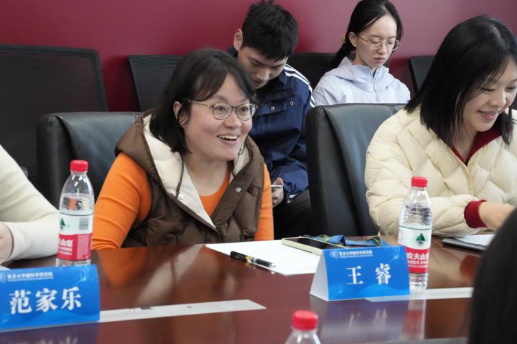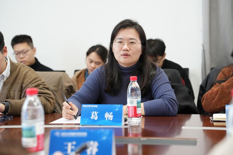 随后,双方在会议室举行了交流座谈。座谈会由王睿主持,她首先代表研究院对同济大学汽车学院师生的到来表示了热烈欢迎,并介绍我院研究生培养的情况。庄英涵从基础概况、特色学生活动和生涯引导等方面进行了全面介绍。同济大学汽车学院党委副书记葛畅介绍了汽车学院的基本情况及发展现状。