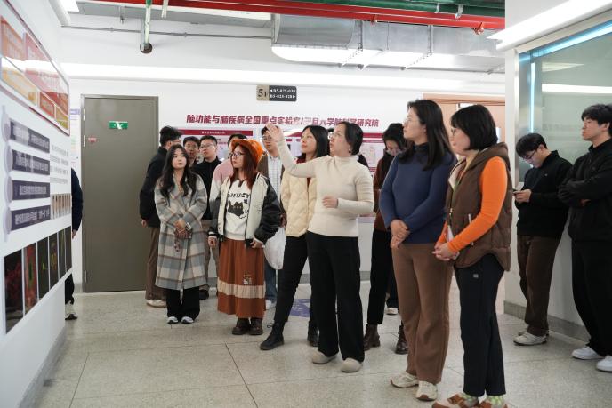 活动伊始,范家乐带领来访师生参观了研究院文化墙,详细介绍了我院的专业研究方向、导师队伍配置以及近年来在脑科学领域取得的重要科研成果,生动展示了我院深厚的学术底蕴与蓬勃的创新活力。